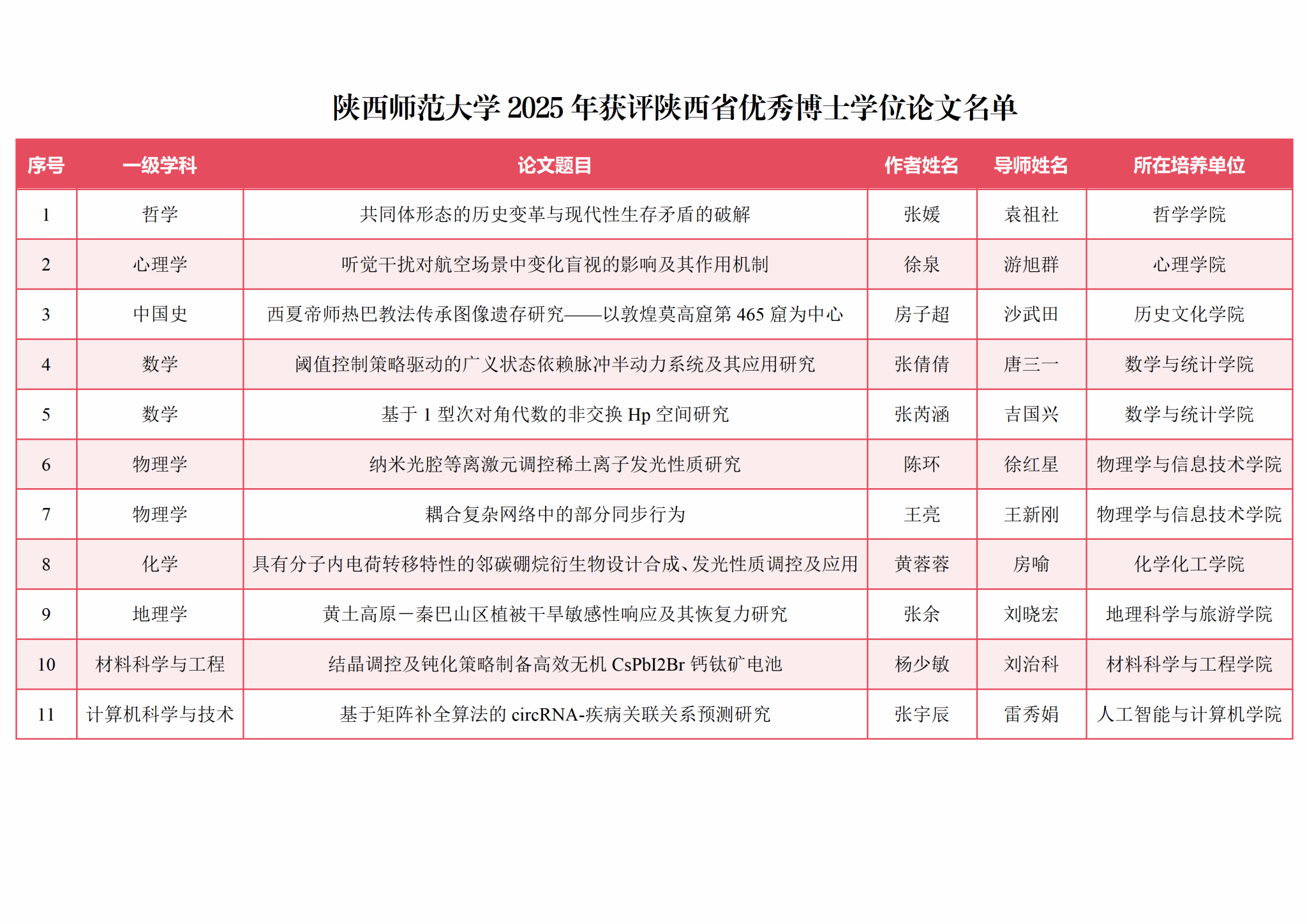 近日,陕西省教育厅、陕西省学位委员会公布了2025年陕西省优秀博士学位论文评选结果,我校11篇论文入选,获评数量创历史新高,位列全省第三。